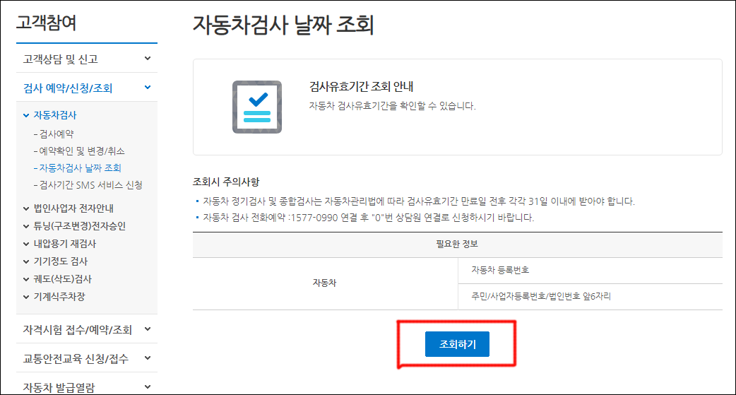 아침에 일어나자마자 부랴부랴 컴퓨터를 키고 "자동차검사기간 조회" 구글링 후 '한국교통안전공단' 홈페이지로 들어가니 아래와 같은 화면이 나오는데, 조회하기 쉽게 잘 만들어 놓았더라고요.