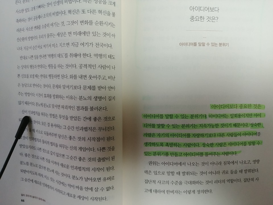 공정무역 기업가 이강백저자의 책 "일이 모두의 놀이가 되게 하라" 67페이지에는 "아이디어보다 중요한 것은 아이디어를 말할 수 있는 분위기"라는 글이 있습니다.