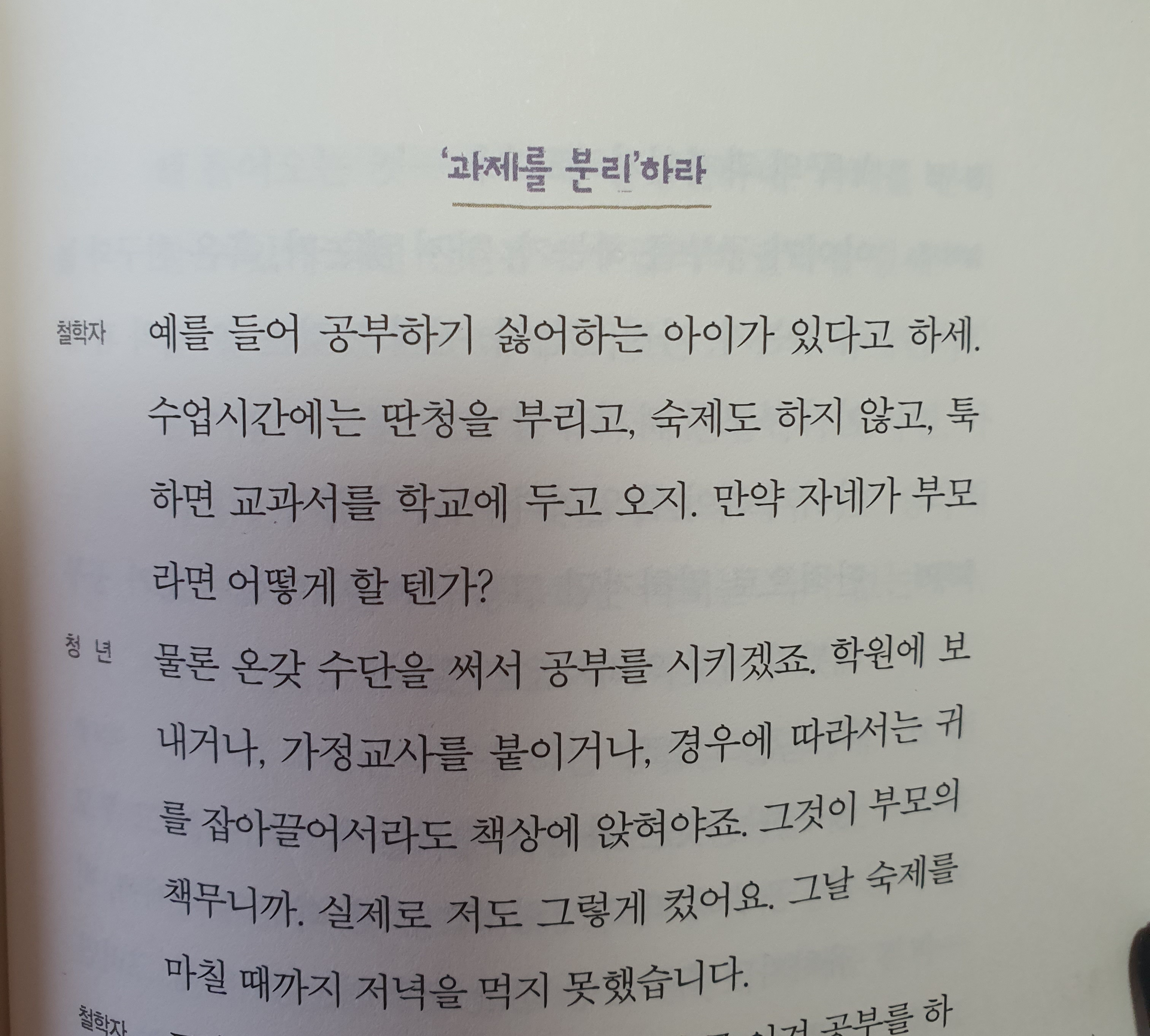 공부하는 것은 아이의 과제일세. 거기에 대고 부모가 "공부해"라고 명령하는 것은 타인의 과제에, 비유하자면 흙투성이 발을 들이미는 행위일세. 그러면 충돌을 피할 수 없게 되지. 우리는 '이것은 누구의 과제인가?라는 관점에서 자신의 과제와 타인의 과제를 분리할 필요가 있네.